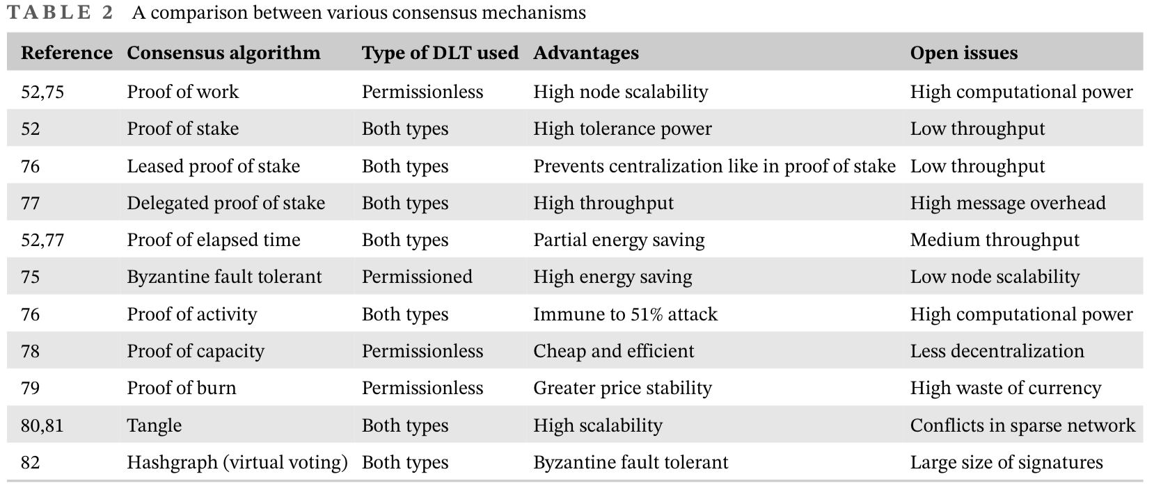 例如,在2PC的情况下,协商一致过程会因任何节点的故障而受损。这些算法是DLT一致性解决方案的先驱。比特币和以太坊等区块链达成共识,并在参与者之间保持一致的观点。只要恶意节点仍然是少数,这种网络就具有故障恢复能力。为了通过向不同于默认行为的节点收费来实现这一点,计算成本被引入作为在区块链中添加块所需的工作证明(PoW)。比特币使用PoW来防止Sybil攻击。69 PoW具有低可扩展性和高延迟,并且需要大量计算能力。POW有几种选择,以避免复杂性和计算能力的浪费。我们将在下面讨论其中一些备选方案。