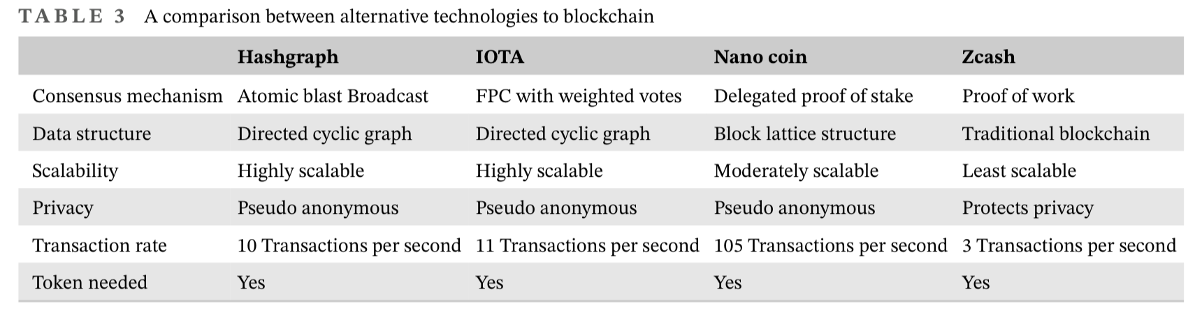 上述四种替代技术具有独特的优势和劣势。了解应用程序或场景的需求并相应地选择技术是至关重要的。表3简要比较了这些技术。例如,Hashgraph和IOTA具有高度可扩展性。另一方面,Zcash的可扩展性较差,但它提供了更好的隐私选项。这些技术可以满足用户的特定需求(如图4所示),而这是简单区块链无法做到的。(i) Nano block lattice使客户能够维持自己的账户链;(ii)IOTA使基于区块链的物联网平台能够帮助机器通信和执行交易,而无需任何费用;(iii)Zcash提供高用户隐私,并使用零知识证明机制;(iv)Hashgraph能够在分布式账本中存储事务时间戳顺序,这对于请求顺序具有高优先级的网络至关重要。132