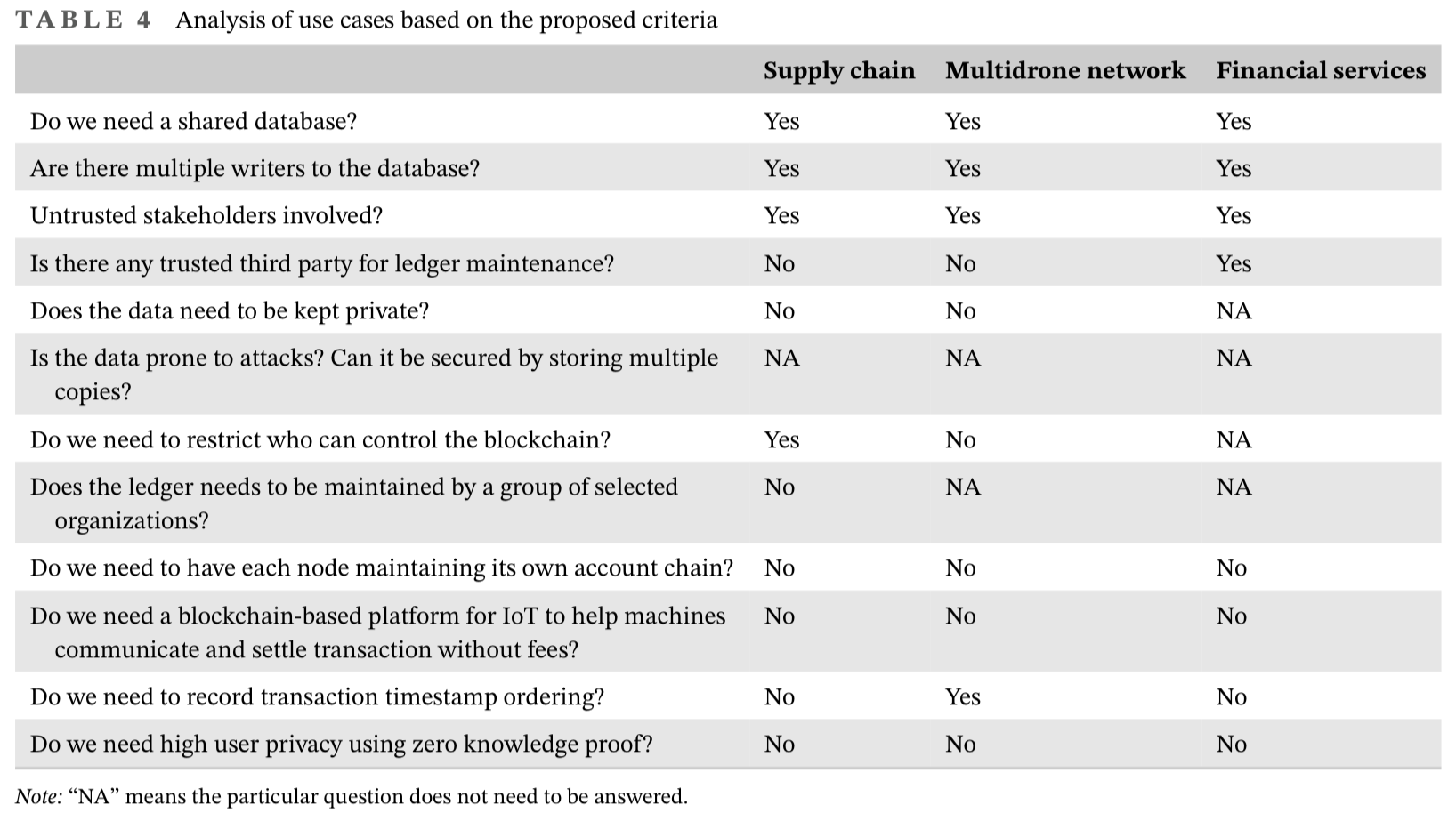 多无人机网络有着广泛的应用,如运送货物、医疗用品和监视。138然而,阻碍无人机应用的主要制约因素之一是其有限的能源供应(电池保持小型以减少无人机的总重量)。由于飞行时间有限,需要频繁充电或更换电池。无人机和充电站的分布式P2P网络可以解决这一问题,并可以显著增加无人机的飞行时间,从而使无人机能够用于多种应用。132我们现在应用提议的框架来评估区块链在多无人机应用中的适用性。141