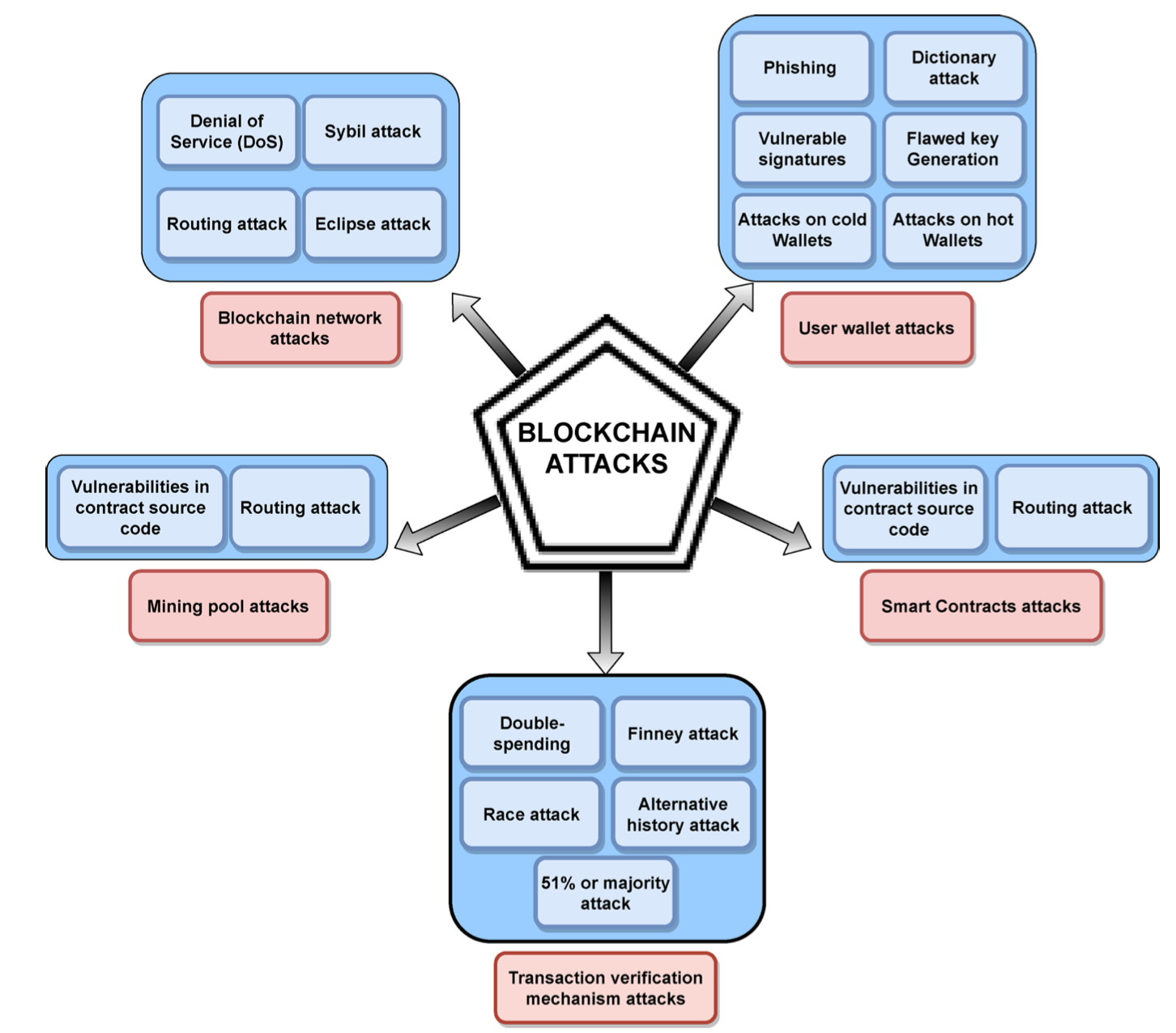 1.量子攻击:量子计算因其解决某些复杂问题的能力而对区块链构成重大威胁。量子计算机可以轻易地破坏现有的加密技术147,并可能提供足够的资源在未来执行51%的攻击(图5显示了区块链可能发生的各种类型的攻击)。各种研究(如参考文献148-152)已经讨论了此类安全问题。