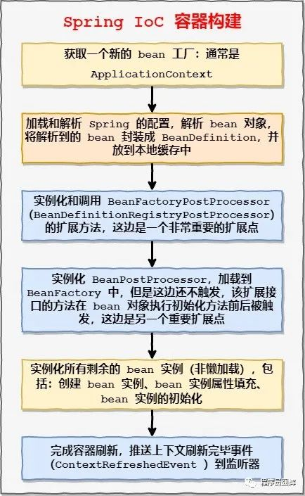 BeanFactory(常用ClassPathXmlApplicationContext)初始化,调用refresh——加载Spring配置,解析成bean对象并注册到BeanDefinition(注册中心)——调用BeanFactoryPostProcessor(前提是实现了这个接口)实例化和使用——调用BeanPostProcessor两个方法(PostProcessBeforeInitialization和PostProcessAfterInitialization)分别在bean初始化前后调用——实例化所有bean——FinishRefresh广播,通知所有监听器完成refresh