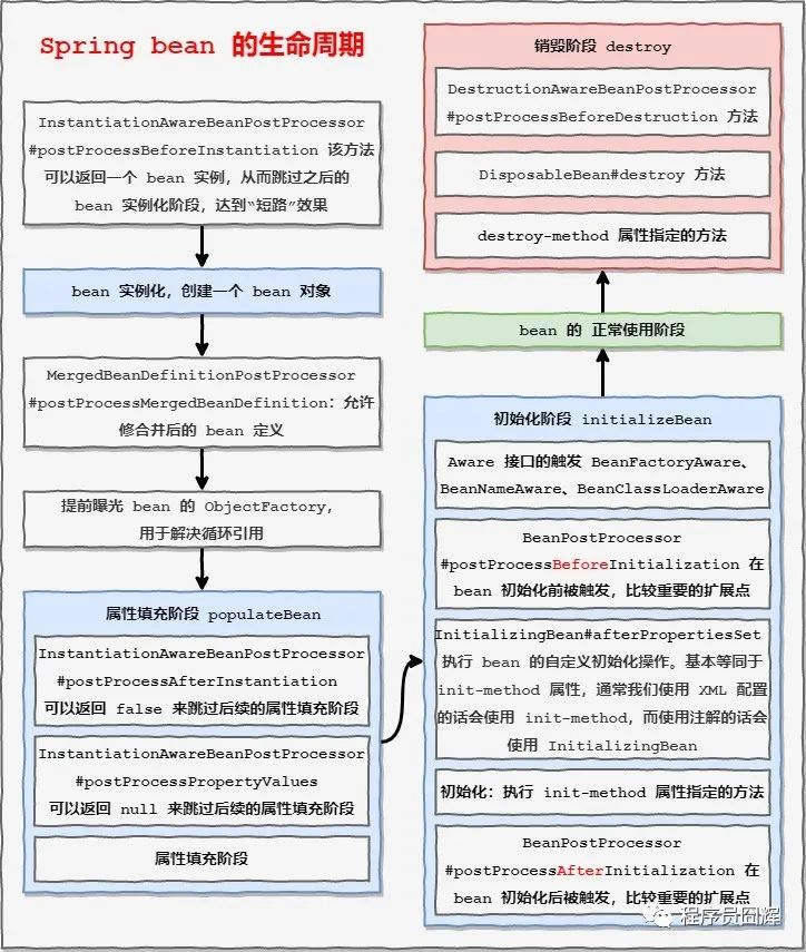 在实例化和初始化时都有一个切面方法,分为在切面前后进行预(后)处理,分别=、为InstantiationAwareBeanPostProcessor和BeanPostProcessor的xxxbeforexxx和xxxafterxxx方法。剩余一些细节:1)实例化后,属性填充前,MergedBeanDefinitionPostProcessor修改合并bean定义,曝光objectFactory,解决循环引用(待消化)。2)初始化前,BeanFactoryAware,BeanNameAware,BeanClassLoaderAware(如果实现,invoke方法)。3)销毁阶段,DestructionAwareBeanPostProcessor有个beforeDestruction方法,然后destory-method。