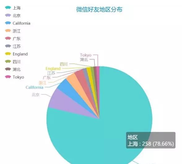 好友来自上海,上面的图表也如实地反应了这一情况。统计性别分布的代码如下