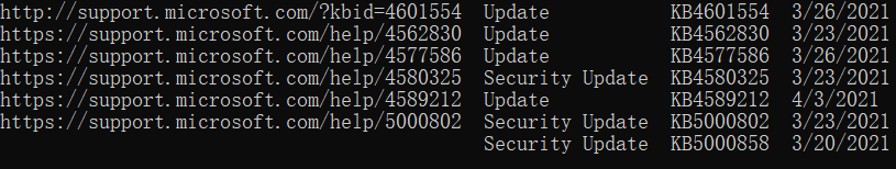 wmic qfe get Caption,Description,HotFixID,InstalledOn