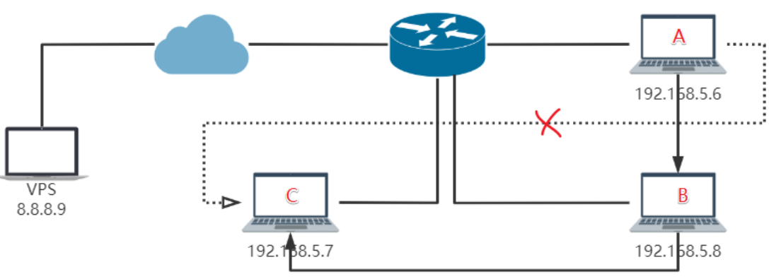 C是领导给的⽬标,存储着该机构的机密⽂件,虽然ABC是处于同⼀路由器下,但是C设置了不允许A访问,所以只能通过控制B去访问了,而B是PC,不⽅便双开3389登陆上去,那就做⼀下端口的转发,而想要从外⽹直接访问,就