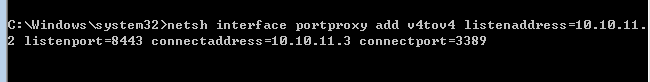 netsh interface portproxy add v4tov4 listen address=192.168.2.4 listenport=8443 connectaddress=10.10.10.6 connectport=443