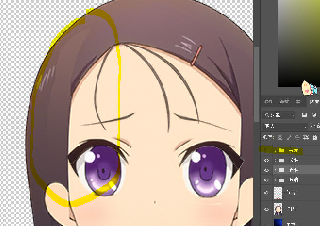 那么我们首先要抠图,将头发、眉毛、上下眼皮、领结、眼白全部扣下来并分类好(分类好是为了后面不乱)
