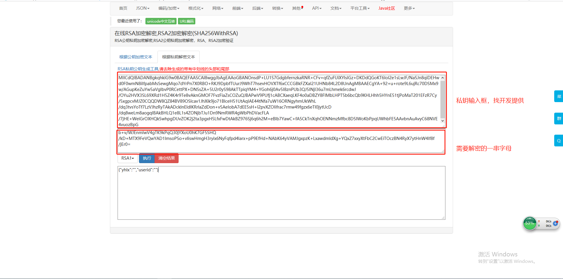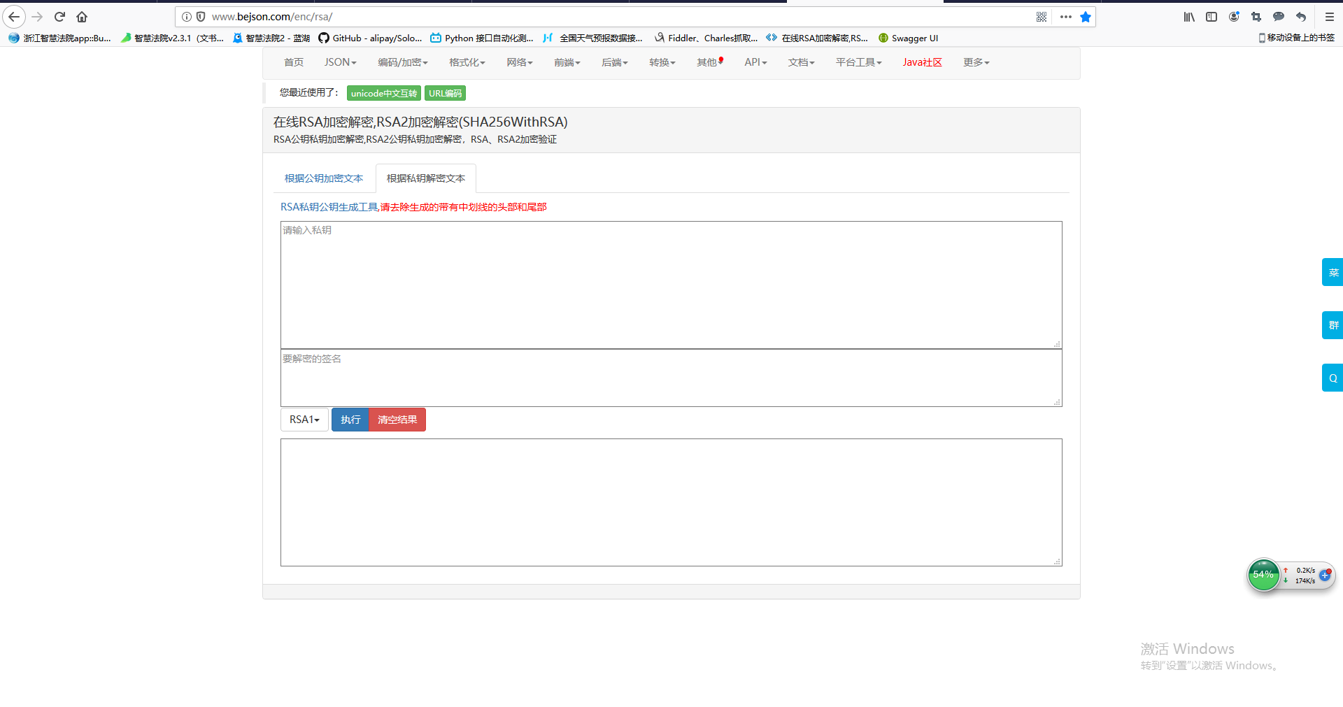 1、浏览器输入链接,进入到在线加解密工具界面,界面选择“根据私钥解密文件”,执行按钮左侧选择RSA1,私钥输入框的私钥需要找开发提供,要解密的签名框填入需要解密的一串数据,点击执行即可解密
