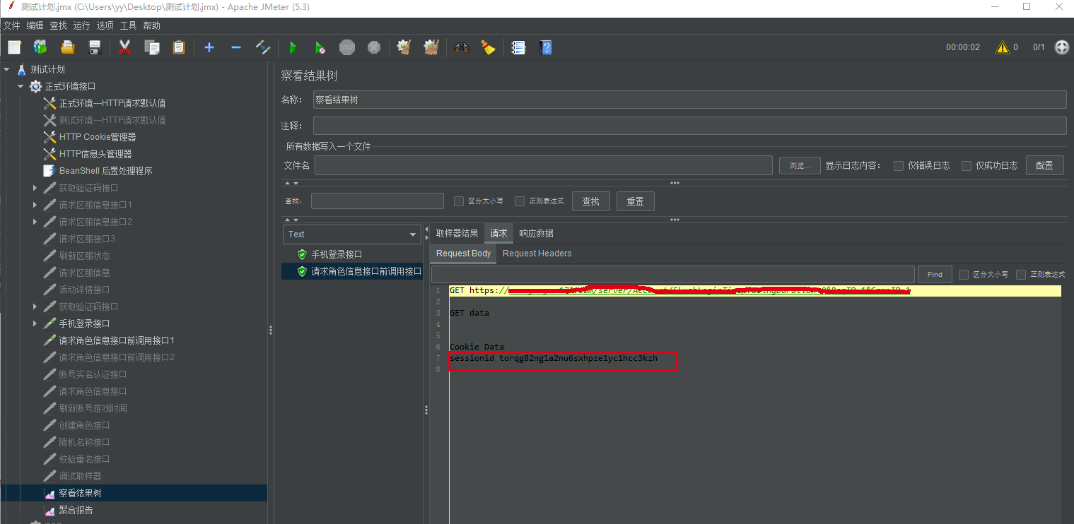 重启Jmeter,新建一个HTTP请求,1个HTTP Cookie管理器,一个查看结果树。(下图是实例截图)可以看到第二个接口中请求参数中获取到了第一个接口的cookie值