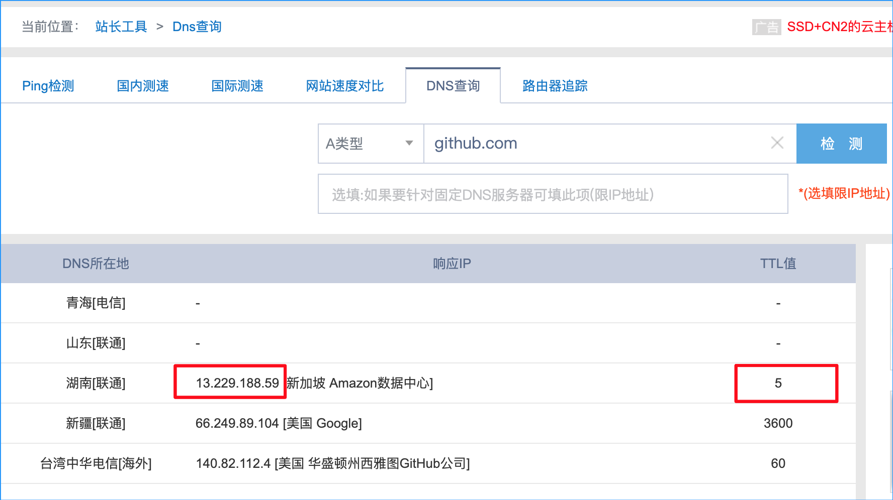 在浏览器中打开DNS查询网站http://tool.chinaz.com/dns,我们输入github.com