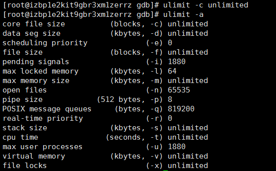 上面shell操作是在 /etc/profile 最后一行添加,上面设置全局开启 core文件调试,大小不限,最后,立即生效。