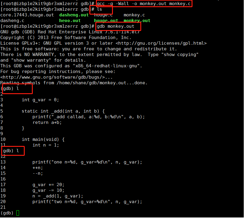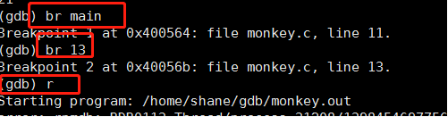 第一个命令 gdb monkey.out 表示 gdb加载 monkey.out 开始调试。