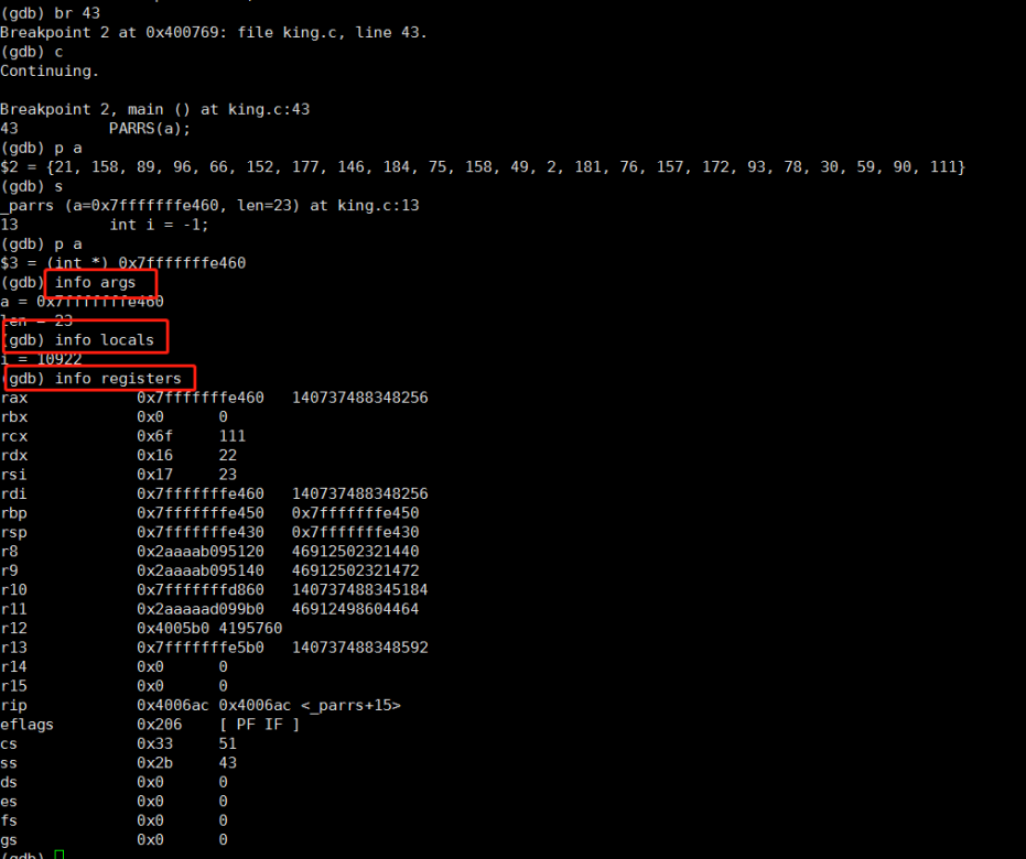 info locals 看当前函数栈上值信息,info registers 表示查看寄存器值。