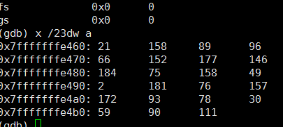 x /23dw a 意思是:查看从a地址开始 23个 4字节,有符号十进制数,输出。