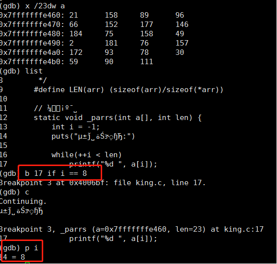 很简单:b 17 if i == 8。在17行设置一个断点,并且只有i==8的时候才会触发。