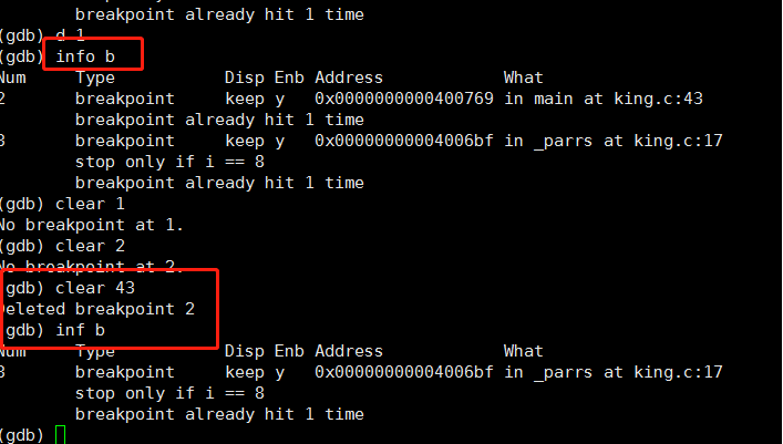 clear 行数或名称,删除哪一行断点,看接下来的演示: