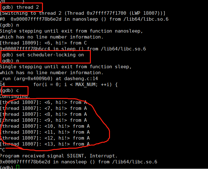 我们用下面命令,只让待调试的线程跑,其它线程阻塞。