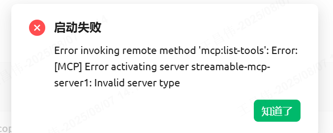 error invoking remote method 'mcp:list-tools':Error:[mcp] error activating server streamable-mac-server:invalid server type