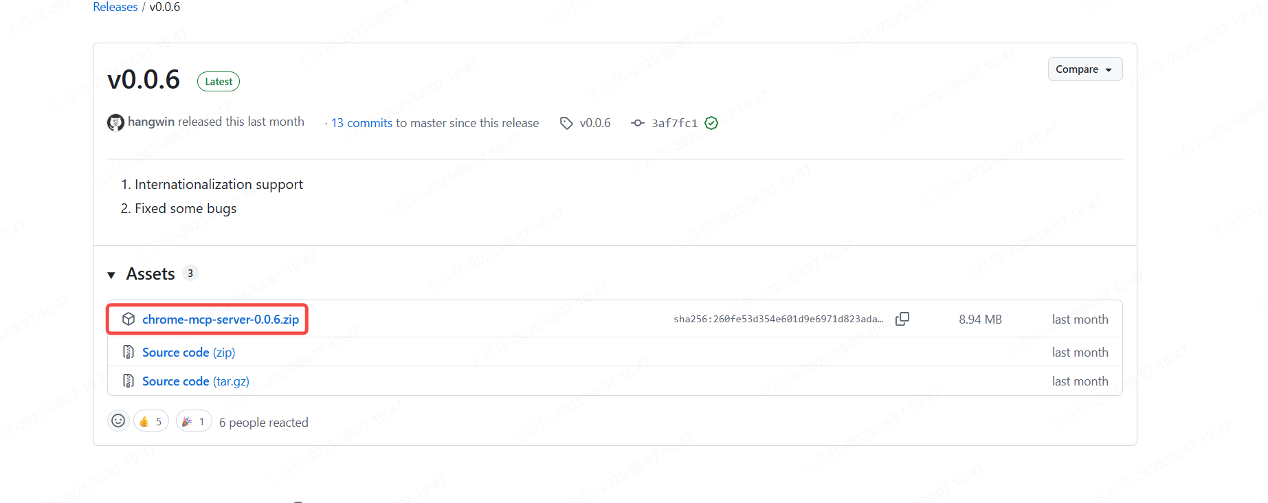 网址:https://github.com/hangwin/mcp-chrome操作步骤:进入项目页面,点击版本号进行下载