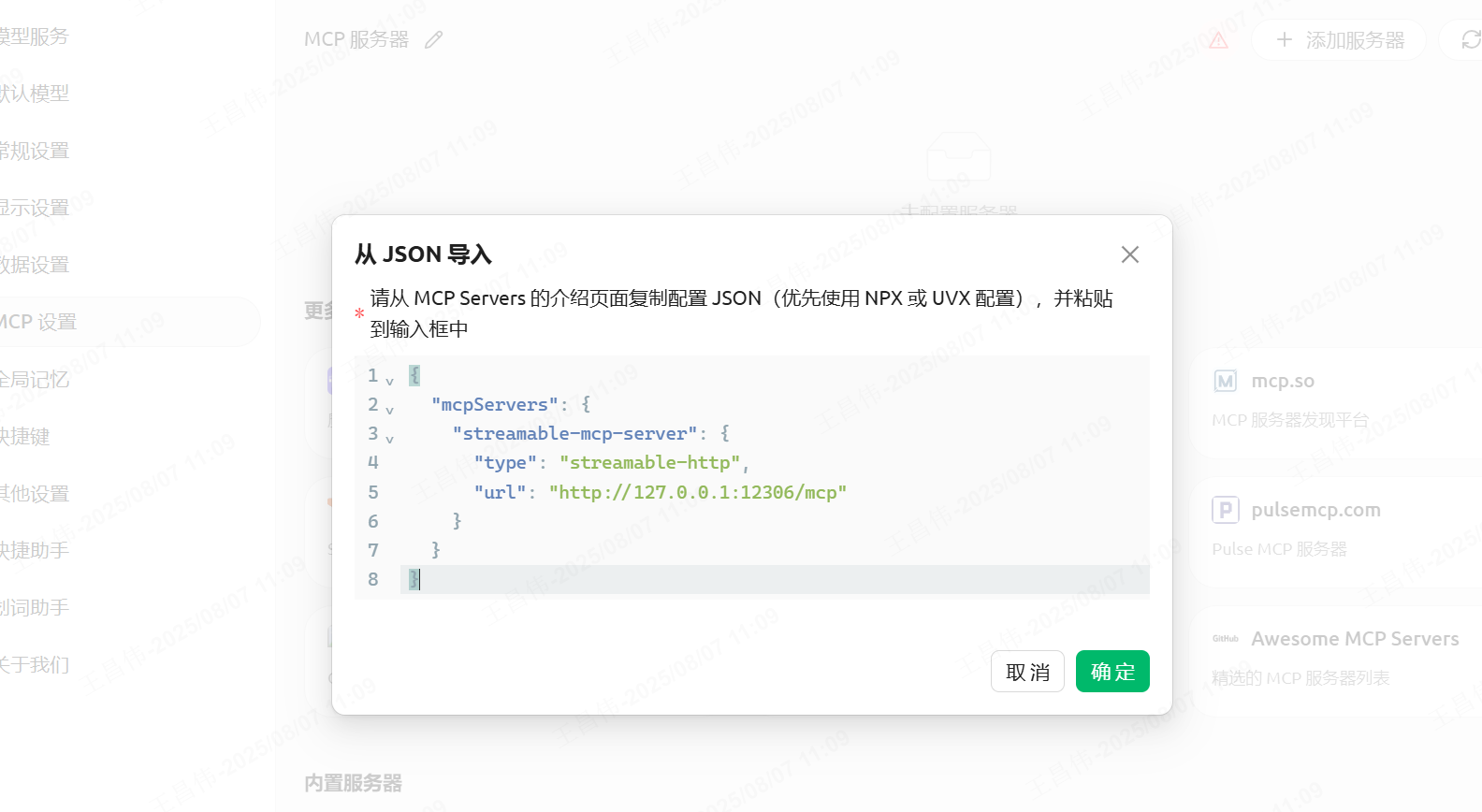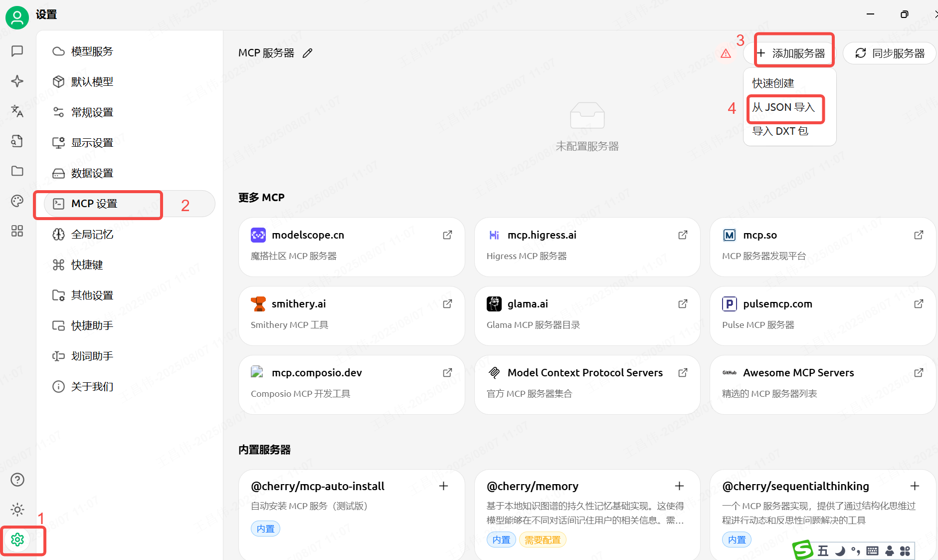 导入的json有的版本cherry studio解析会出现问题,服务启动会报错需要再手动配置MCP