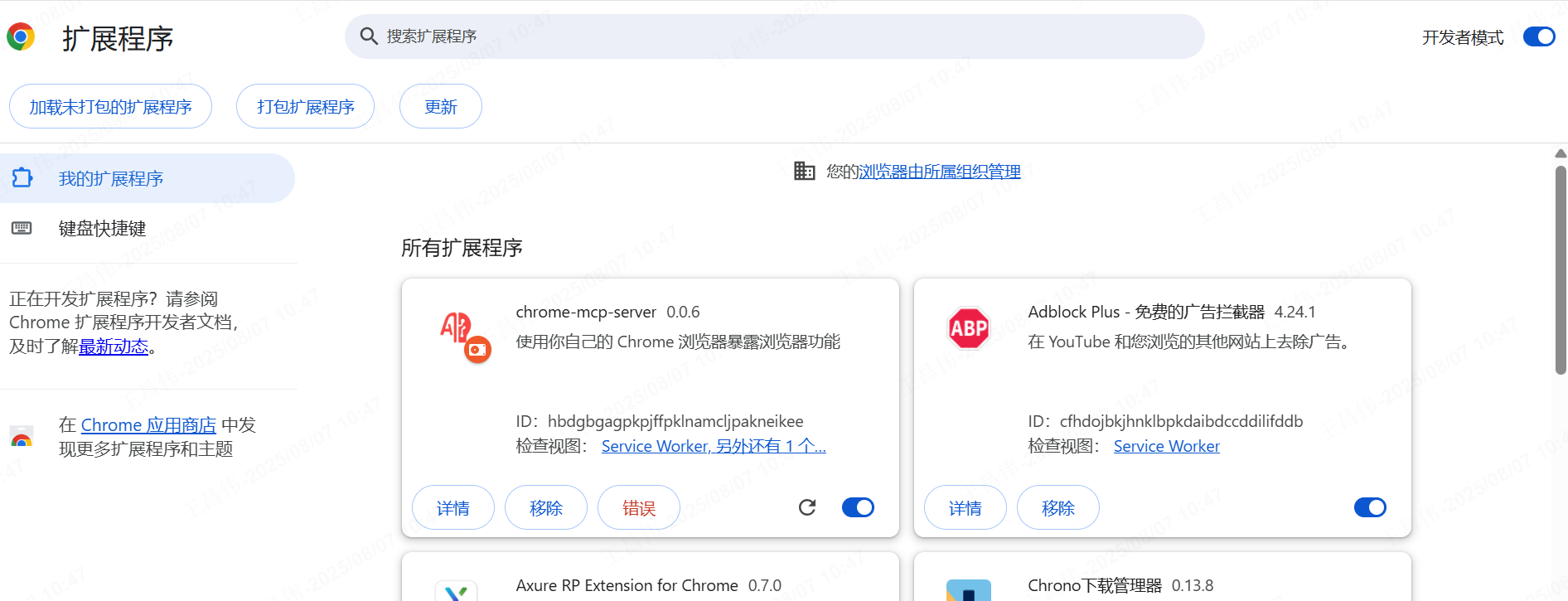 打开谷歌的扩展程序页面,打开开发者模式地址:chrome://extensions/