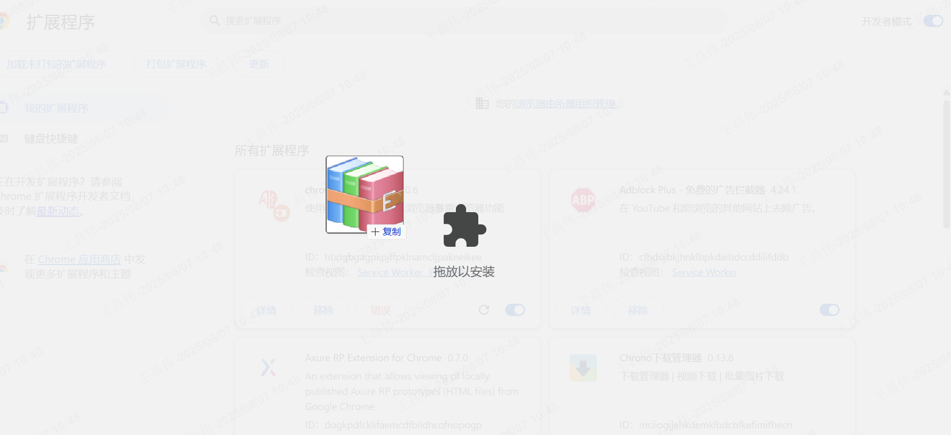 把下载的zip文件(注意不需要解压)直接拖到谷歌的扩展程序页面