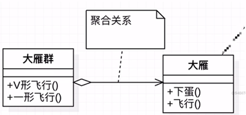 (6)大雁群是N个大雁组成的(聚合关系是空心菱形和箭头,是整体和局部的关系,两者拥有独立的生命周期,是has a 的关系,比如大雁群有很多大雁其中有一只大雁生病挂了,但是大雁群还是存在,但是对于挂了的那只大雁生命周期已经结束了,所以他们有着独立的生命周期)