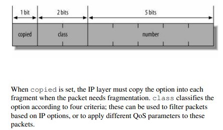//选项格式: // 1.type中指示该选项在分片时是否需要被拷贝 // 2.ptr从1算起,1为type的位置 // 3.len不包括type字段,其余都包括(len,ptr,选项内容)