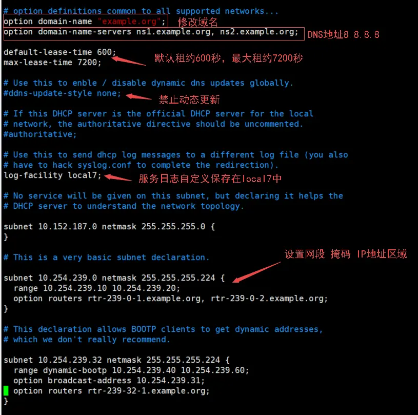 ddns-update-style none; //配置DHCP和DNS为动态更新,