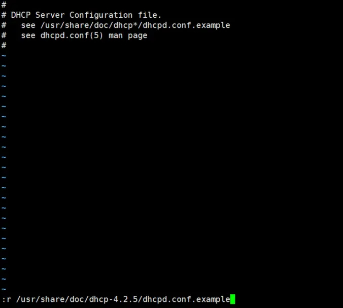 在末行模式下输入”r /usr/share/doc/dhcp-4.2.5/dhcpd.conf.example” 回车,获取dhcp配置模板,版本号可自行使用tab补全。