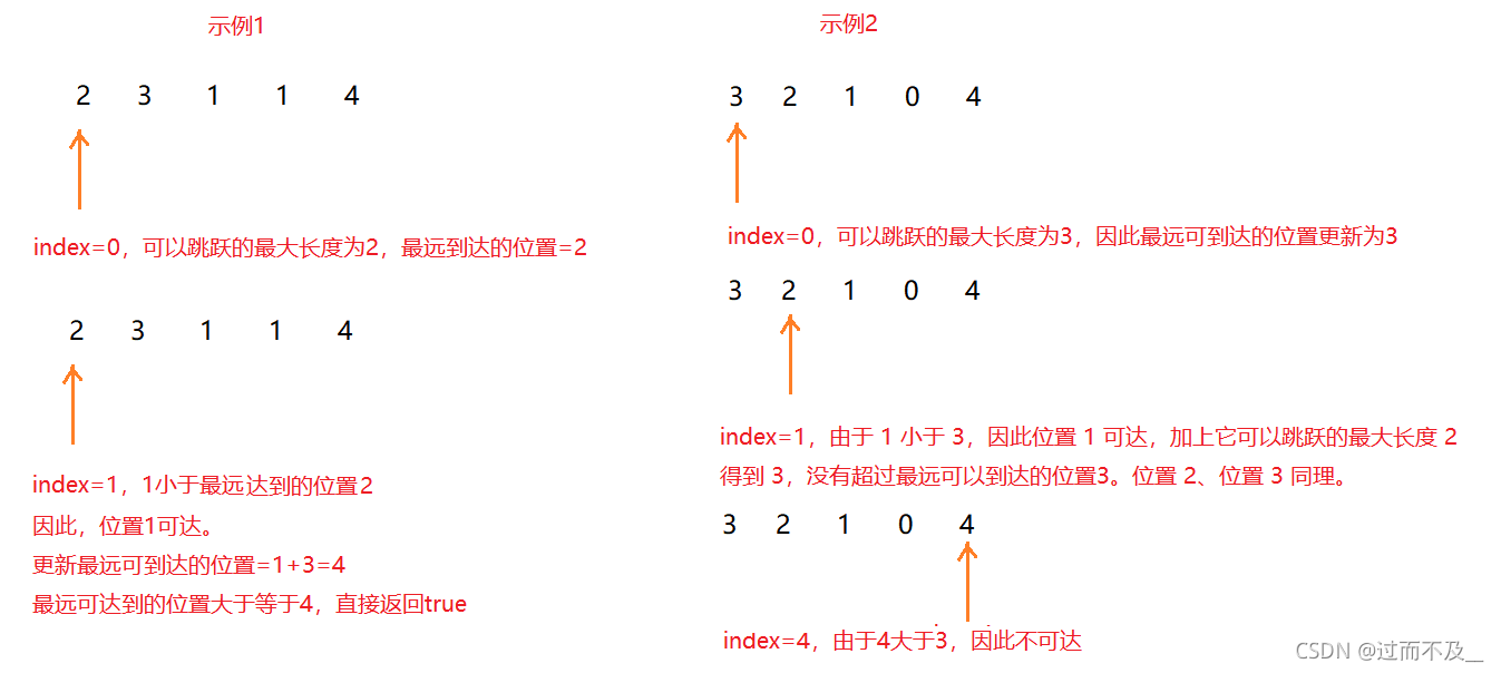 通过上述分析:首先,依次遍历数组中的每一个位置,并实时获取最远可以到达的位置。对于当前遍历到的位置 x,如果它在最远可以到达的位置的范围内,那么就可以从起点通过若干次跳跃到达该位置,因此我们可以用x + num[x] 更新最远可以到达的位置。在遍历的过程中,如果 最远可以到达的位置大于等于数组中的最后一个位置,那就说明最后一个位置可达,直接返回 True 。反之,如果在遍历结束后,最后一个位置仍然不可达,就返回 False 。
