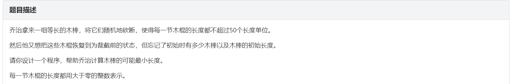 sum=0,minlen=0;//sum表示n根木棍长度之和,minlen表示n根木棍的最大长度,即:一开始的最小可能长度