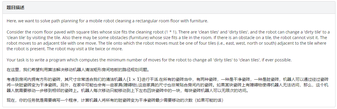 这道题可以先用bfs把任意两个脏点的最小距离算出来,然后利用TSP算出答案。