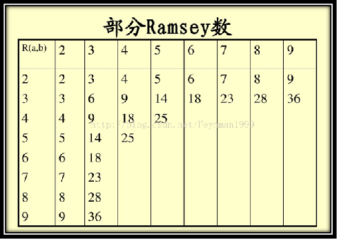 对于给定的两个整数m,n≥2,则一定存在一个最小整数r,使得用两种颜色(例如红蓝)无论给Kr的每条边如何染色,总能找到一个红色的Km或者蓝色的Kn。显然,当p>=r的时候,Kp也满足这个性质。r可以看做一个有关m,n的二元函数,即r(m,n)。
