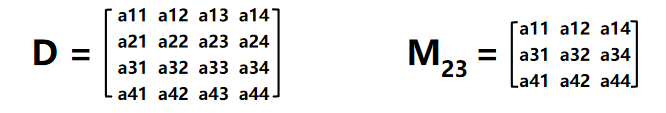 把一个n阶行列式中的元素aij所在的第i行和第j列划去后,留下来的n-1阶行列式叫做元素aij的余子式,记作Mij。记Aij=(-1)i+j Mij,叫做元素aij的代数余子式。例如: