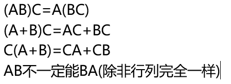 矩阵的乘法运算满足结合律,左分配律,右分配律,但是不满足交换律。即: