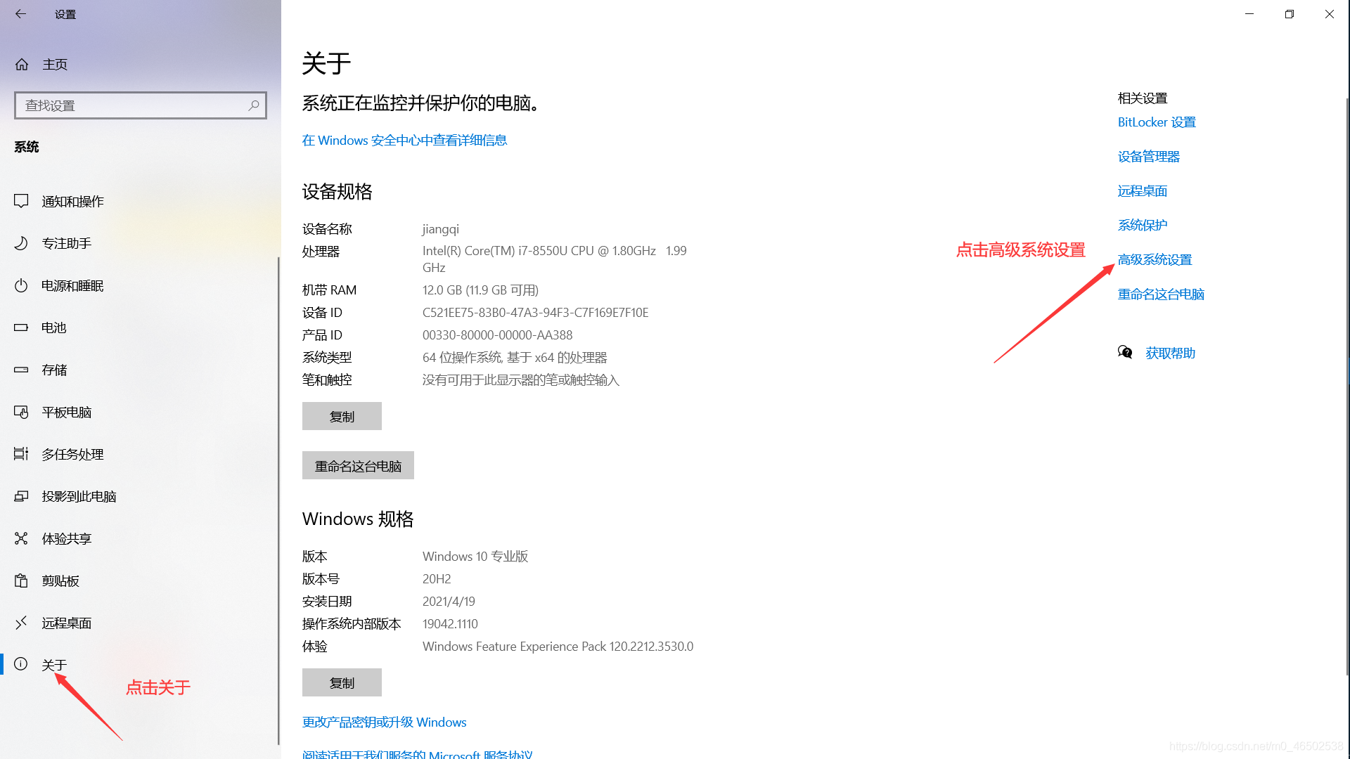 进入设置中,点击系统,进入关于页面,点击高级系统设置