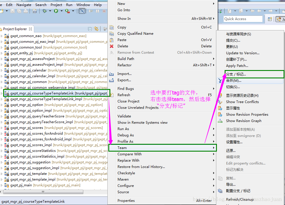 1.选中要打tag的文件(单个文件),右击选择“team”,然后选择“分支/标记”