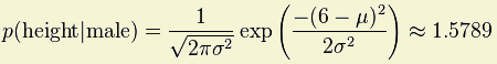 高为6英尺的概率的相对值等于1.5789(大于1并没有关系,因为这里是密度函数的值,只用来反映各个值的相对可能性)。