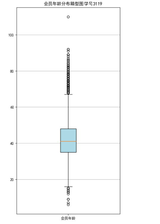 plt.boxplot(age,patch_artist=True,labels=['会员年龄'],boxprops={'facecolor':'lightblue'})
