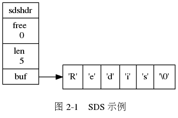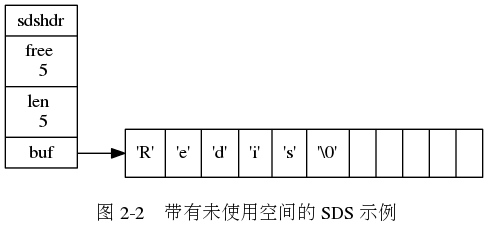 图2-2展示的SDS与2-1的区别在于为buf数组分配了五字节未使用空间,所以它的free属性的值为5。