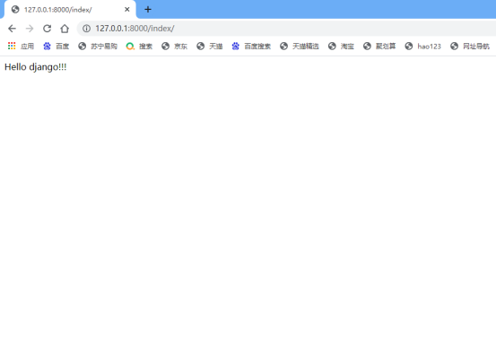 最后访问地址:http://127.0.0.1:8000/index/ ,返回"Hello django!!!”