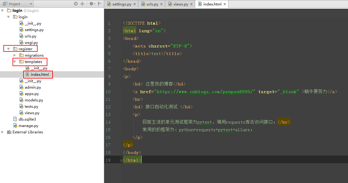 在应用register/目录下创建一个templates包,再新建一个templates/index.html文件