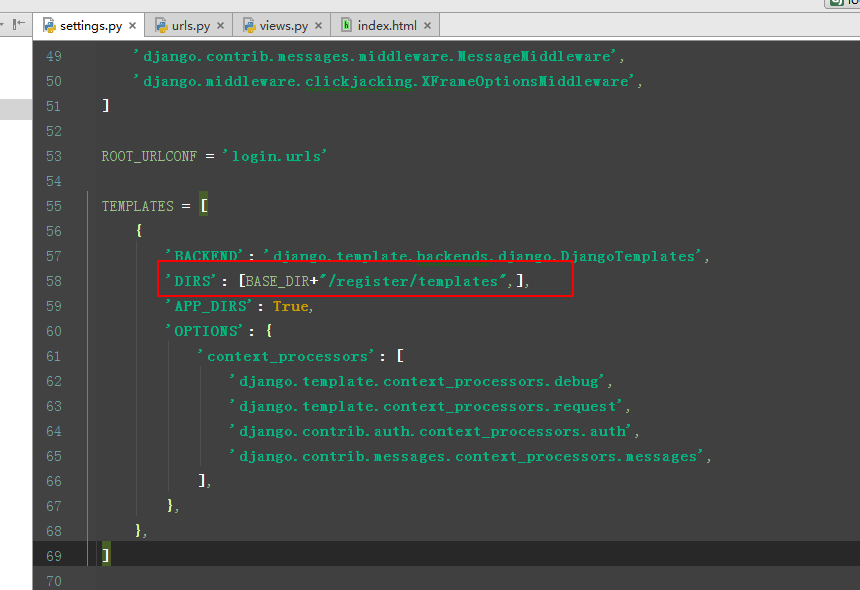 2、在settings.py脚本里面添加模板的路径,修改TEMPLATES 中的 DIRS 为[BASE_DIR+"/register/templates",]