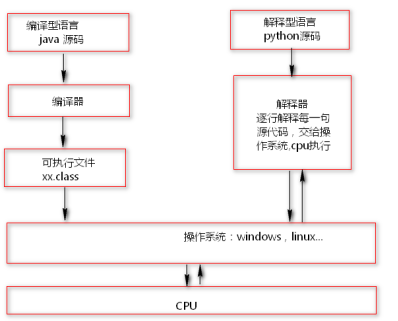 解释型语言执行过程:使用python开发了一个3行代码的源程序,当程序运行的时候,解释器一行一行的进行解释。这样解释性语言每执行一次要翻译一次,效率比较低。