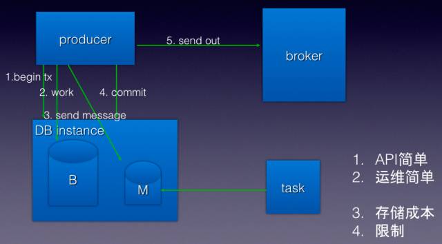 现在看看这种模型的优缺点。这种模型 API 非常简单,业务开发只需要使用 sendMessage 这个简单的 API,不需要关心事务等。同时运维也非常简单,我们的做法是公司的 DBA 给所有 DB 实例上预初始化一个消息库,业务根本不用关心,对业务完全是透明,API 把这些封装在底下,使用起来还是非常简单。 但是这样有另外一个问题,就是存储成本。本来只有业务操作访问 DB,然后还要持久化消息。原来承受一个 QPS 现在可能只能承受一半了,所以对数据库操作还是略重一些