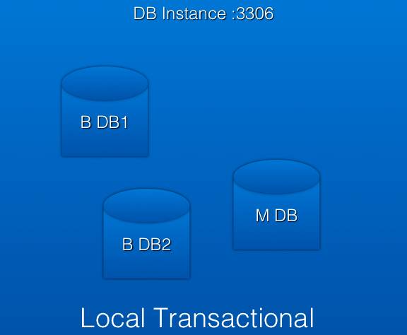 在一个 DB 实例中,比如 3306 这个,使用同一个连接,对多个库的操作是可以放在同一个事务里的。这样是可以保证数据的一致性,这是由数据库决定。比如图中的业务 DB1,业务 DB2 和一个消息 DB 都在同一个实例里,是可以放在同一个事务里的。