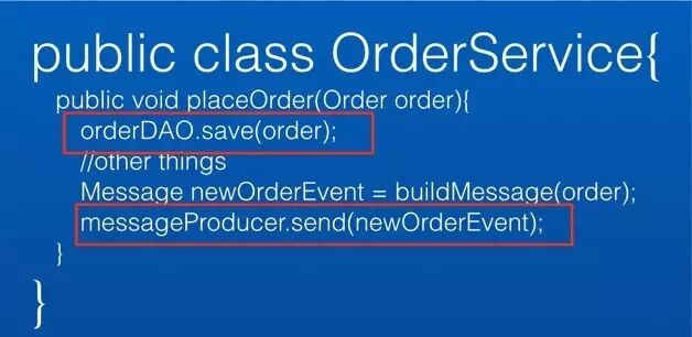 上图是一个订票的订单服务,生成的新订单。如果订单持久化成功(上面的红框 ),消息发送失败( 下面的红框 )。那么用户看到下单成功,假设代理商服务订阅这个消息是否给用户出票,那么现在的情况就是票没出来,这会引起用户投诉。但是如果先发消息,然后再持久化订单,那可能就是订单出票了,但其实这个订单还没下呢,这就会造成公司的损失。