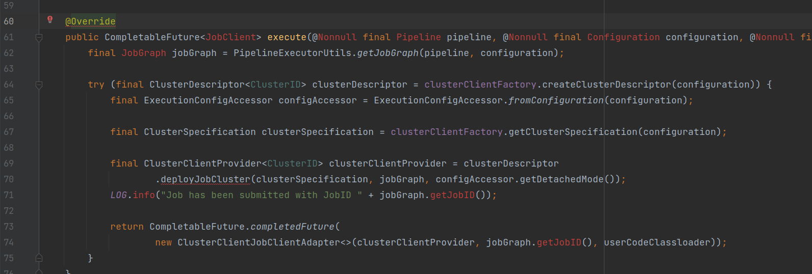 - 再调用任务执行器实例的YarnJobClusterExecutor.execute(),执行任务代码;