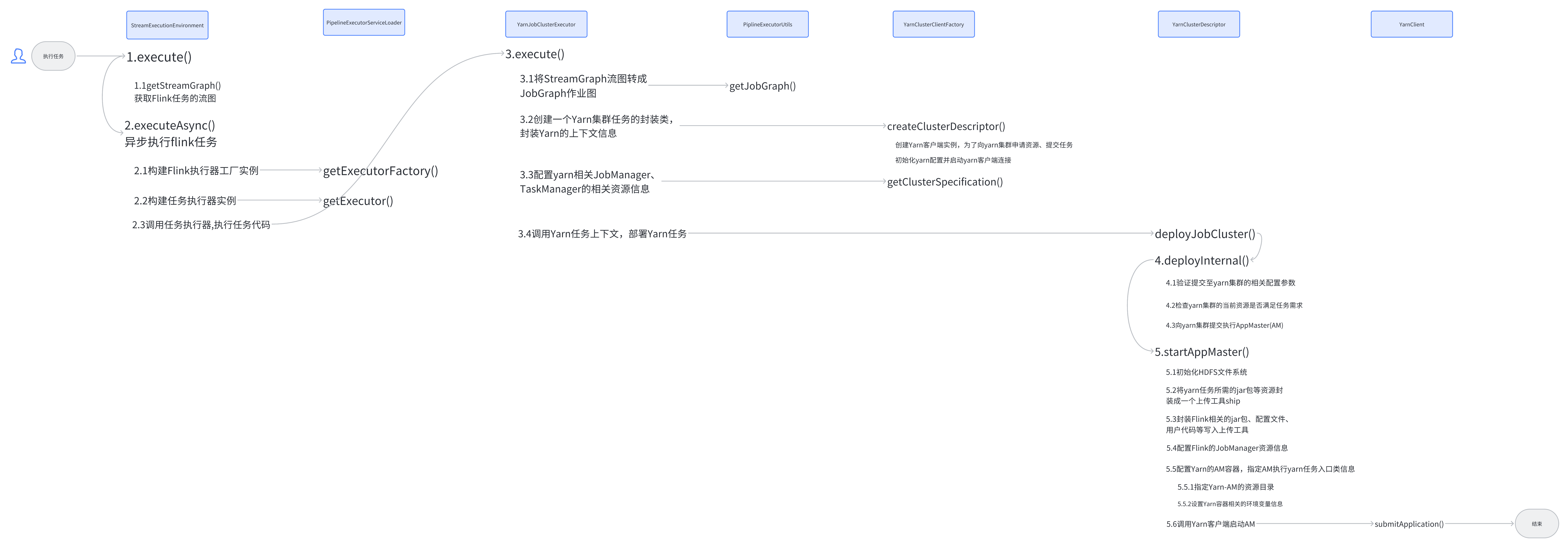flink任务起点从StreamExecutionEnvironment的execute()方法开始,依次进行flink任务环境配置,yarn环境配置,中间有不少层层调用,第一次读起来可能会有点乱,但多读几次就好了。